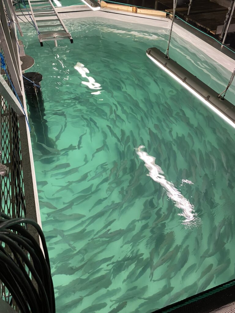 During the experiment in brackish water, the salmon grew from 100 to 1000 grams. After which they were transferred to seawater tanks, and kept there until they had reached a body weight of 2.5 kg.